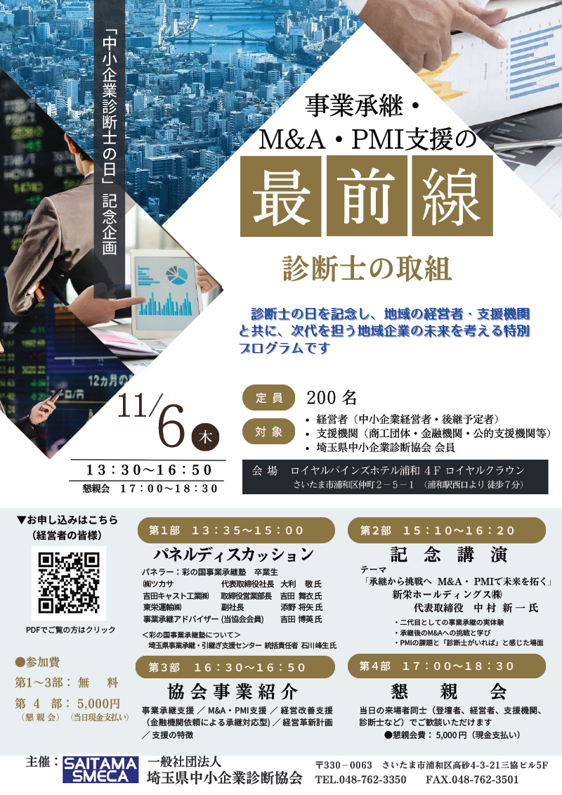 埼玉県中小企業診断協会では、今年の「中小企業診断士の日」に合わせた記念企画として、「事業承継やM&A/PMI関連」をテーマにイベントを開催します。