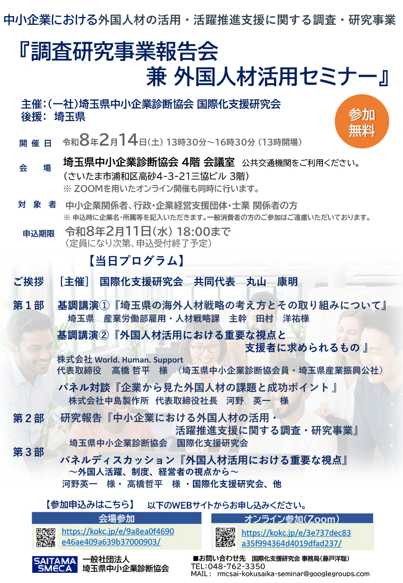 埼玉県中小企業診断協会 国際化支援研究会では、「調査・研究事業報告会 兼 外国人材活用セミナー」を開催いたします。